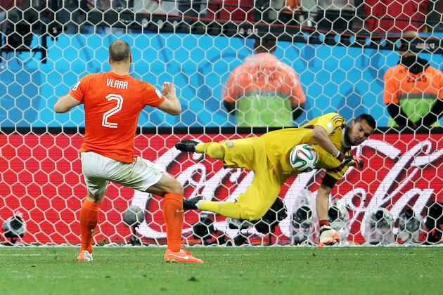 | Shujaa wa matuta: Sergio Romero akiokoa penalti ya Ron Vlaar |